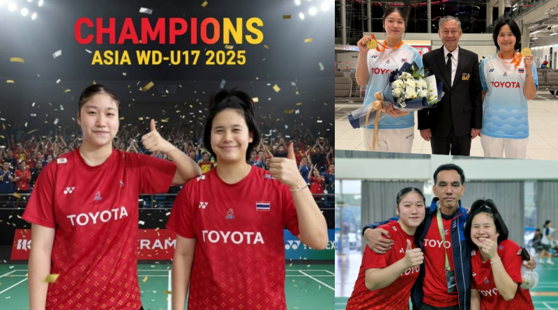 “ธารา” พัทธรินทร์ เอี่ยมวารีศรีสกุล และ “น้ำว้า” ศาริสา จันทร์แพง ที่ชนะเลิศ(เหรียญทอง) การแข่งขันแบดมินตันเยาวชนชิงแชมป์เอเชีย 2025 ที่เมืองเฉิ่งตู สาธารณรัฐประชาชนจีน